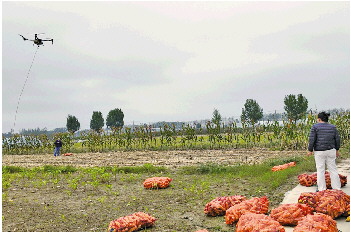 “雇人搬一袋要10元钱,这7分地得花200元。”他搓着手上的泥渍说。听说京信合作社有无人机转运服务,他联系了鸡黍镇京信为农服务中心,提前预约了10日的运输。话音刚落,玉米地空地上已响起旋翼的轰鸣。一架大型无人机缓缓升空,搅动着湿冷的空气。苏保东弯腰攥紧粮袋绳索,快步走到无人机下方,将挂钩牢牢拴紧。这是他当天转运的第8袋玉米,“雨天扛着袋子踩泥路,一步一滑,一天顶多运两亩,现在无人机十分钟就跑7趟!”